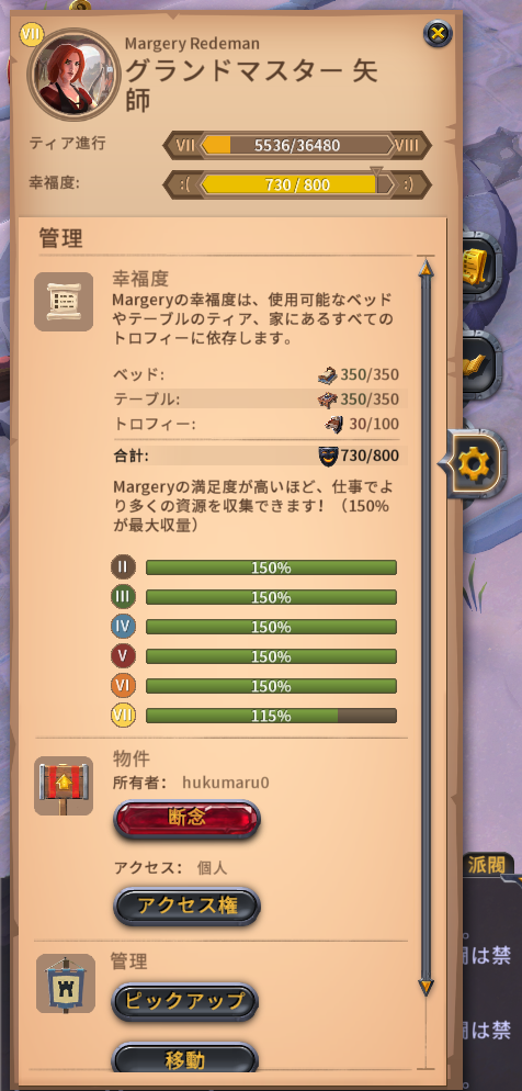 自分の渡したいティアの労働者本が、150%になるように家具やトロフィーを配置すると、リターンの恩恵が大きくなります。